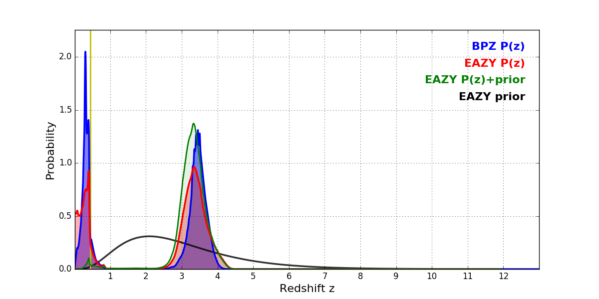 In P(z) plots: Yellow lines mark the cluster redshift z = 0.443,