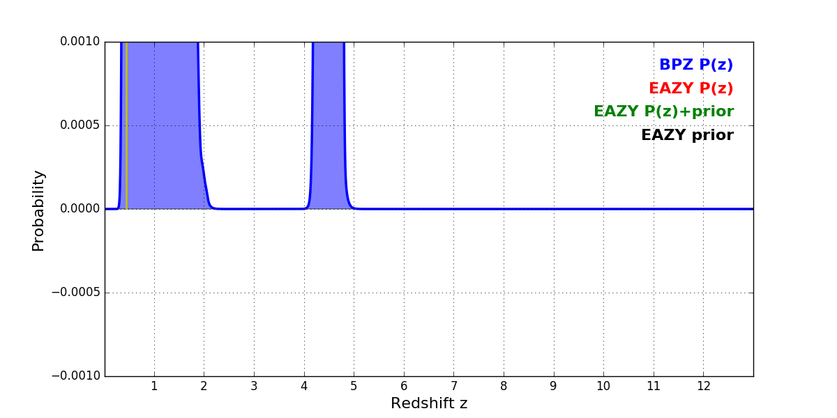 In P(z) plots: Yellow lines mark the cluster redshift z = 0.443,
