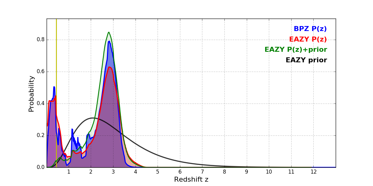 In P(z) plots: Yellow lines mark the cluster redshift z = 0.443,