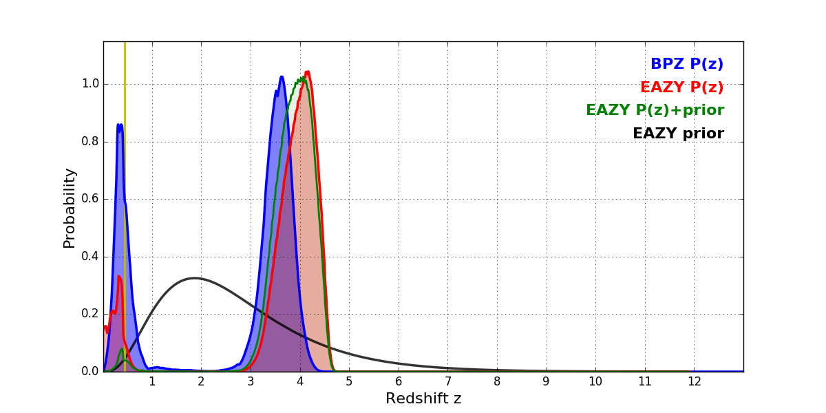 In P(z) plots: Yellow lines mark the cluster redshift z = 0.443,