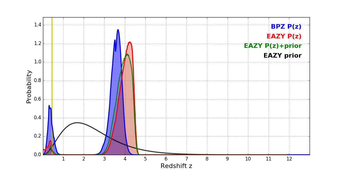 In P(z) plots: Yellow lines mark the cluster redshift z = 0.443,