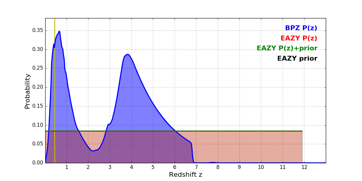 In P(z) plots: Yellow lines mark the cluster redshift z = 0.443,