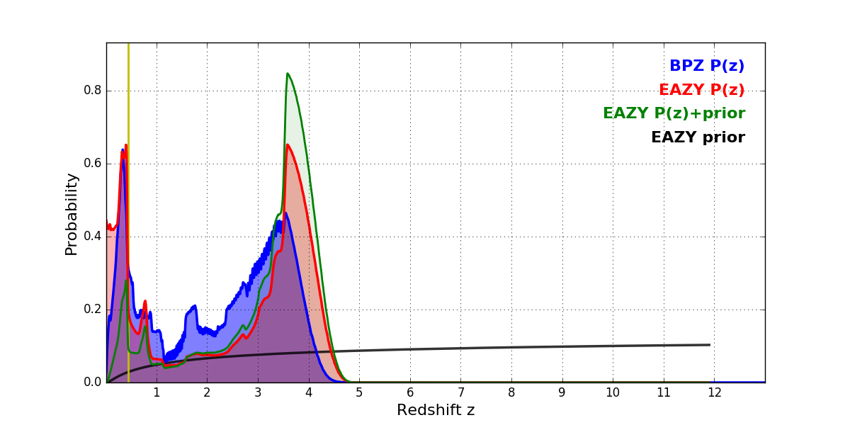 In P(z) plots: Yellow lines mark the cluster redshift z = 0.443,