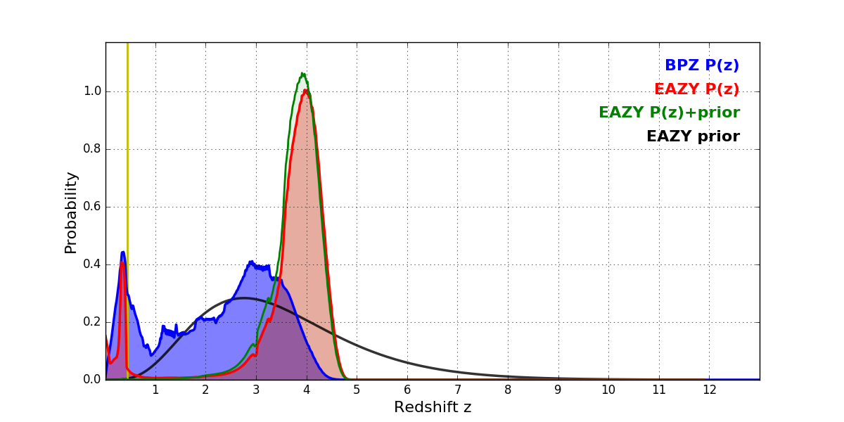 In P(z) plots: Yellow lines mark the cluster redshift z = 0.443,