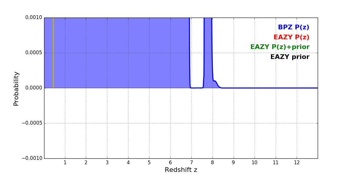 In P(z) plots: Yellow lines mark the cluster redshift z = 0.443,