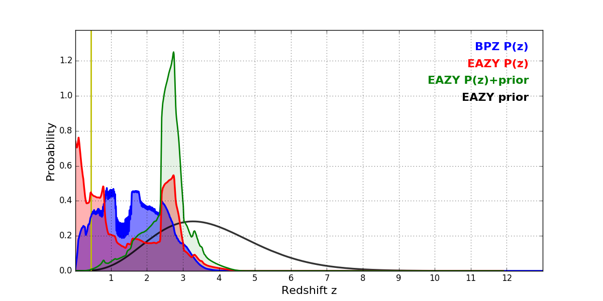 In P(z) plots: Yellow lines mark the cluster redshift z = 0.443,