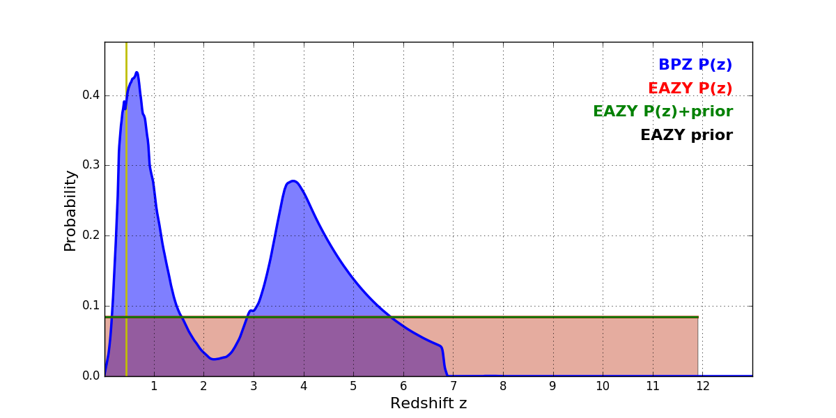 In P(z) plots: Yellow lines mark the cluster redshift z = 0.443,