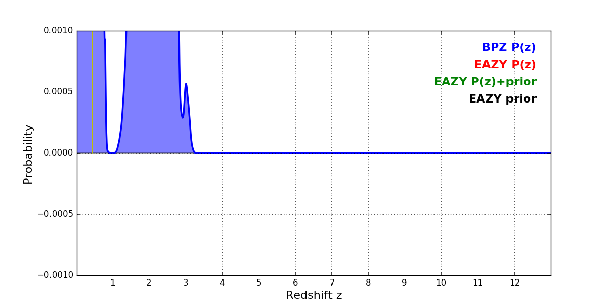 In P(z) plots: Yellow lines mark the cluster redshift z = 0.443,
