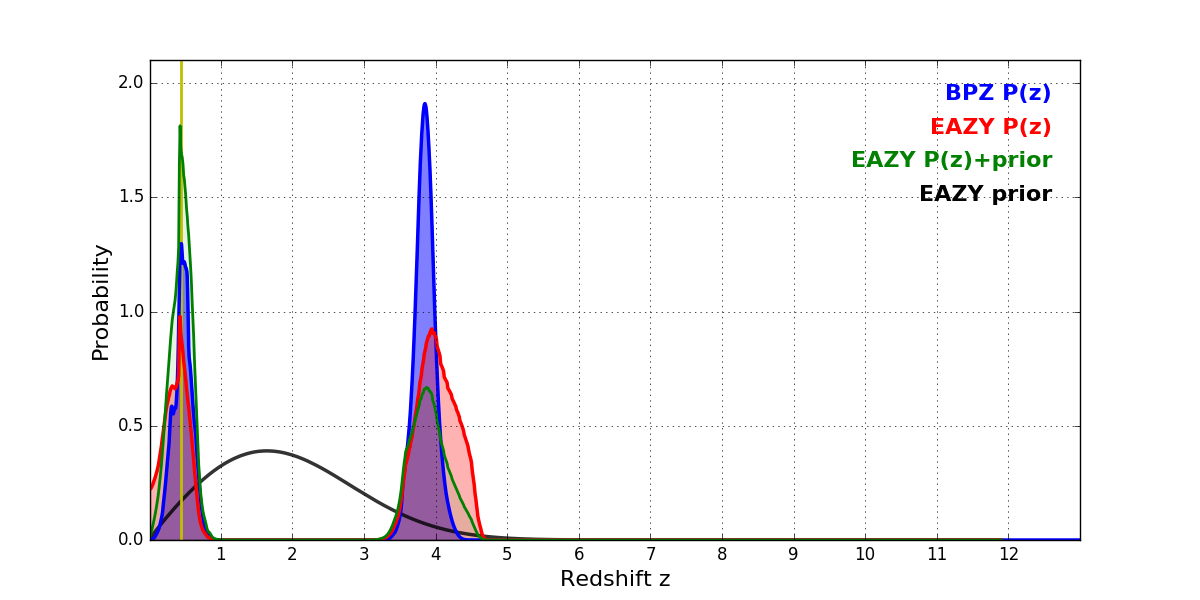 In P(z) plots: Yellow lines mark the cluster redshift z = 0.443,