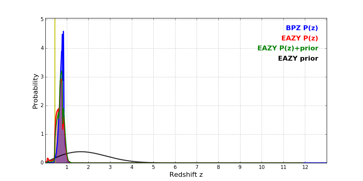 In P(z) plots: Yellow lines mark the cluster redshift z = 0.443,