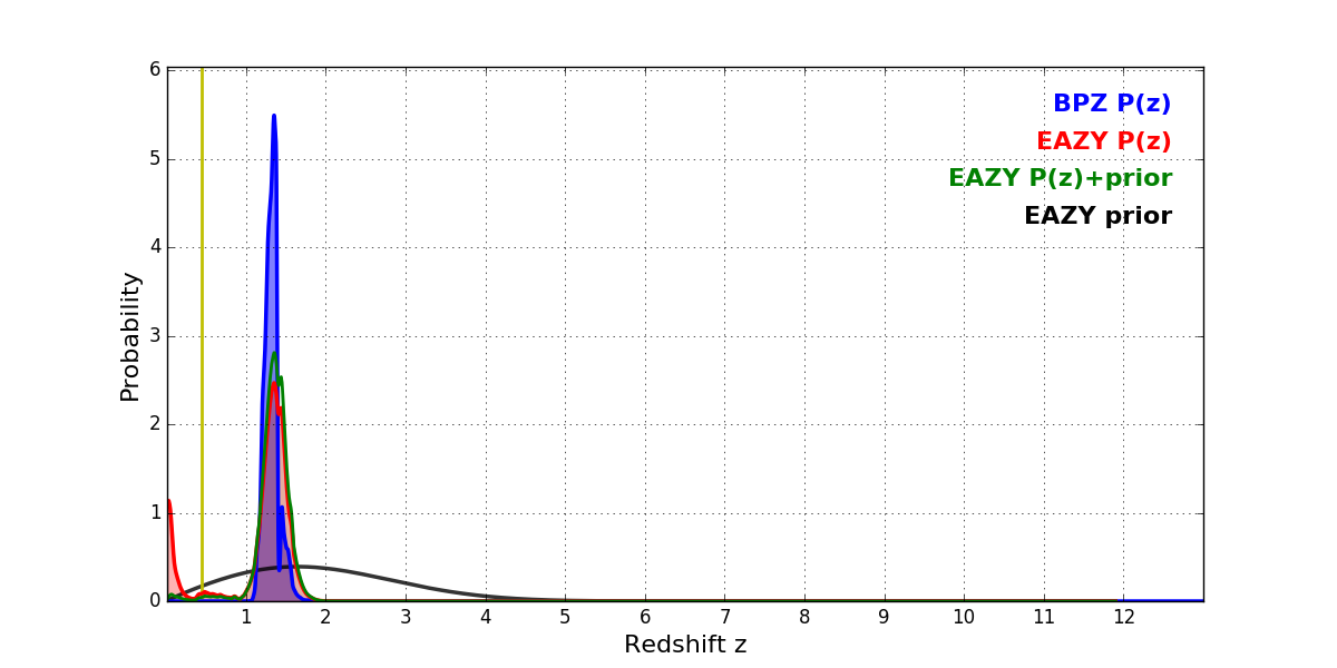 In P(z) plots: Yellow lines mark the cluster redshift z = 0.443,