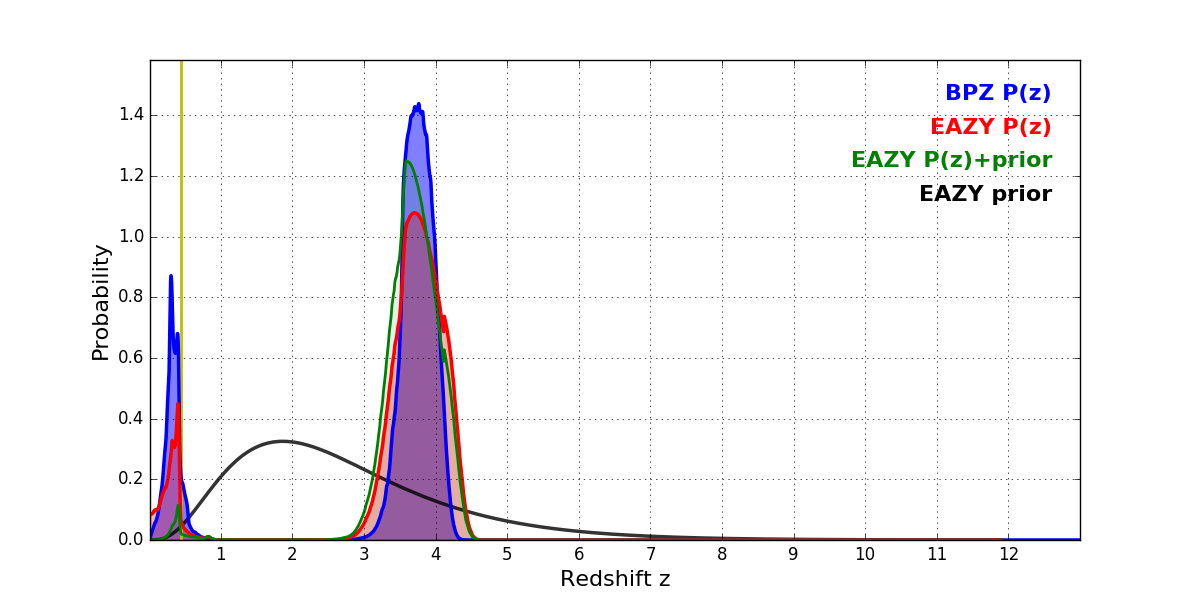In P(z) plots: Yellow lines mark the cluster redshift z = 0.443,