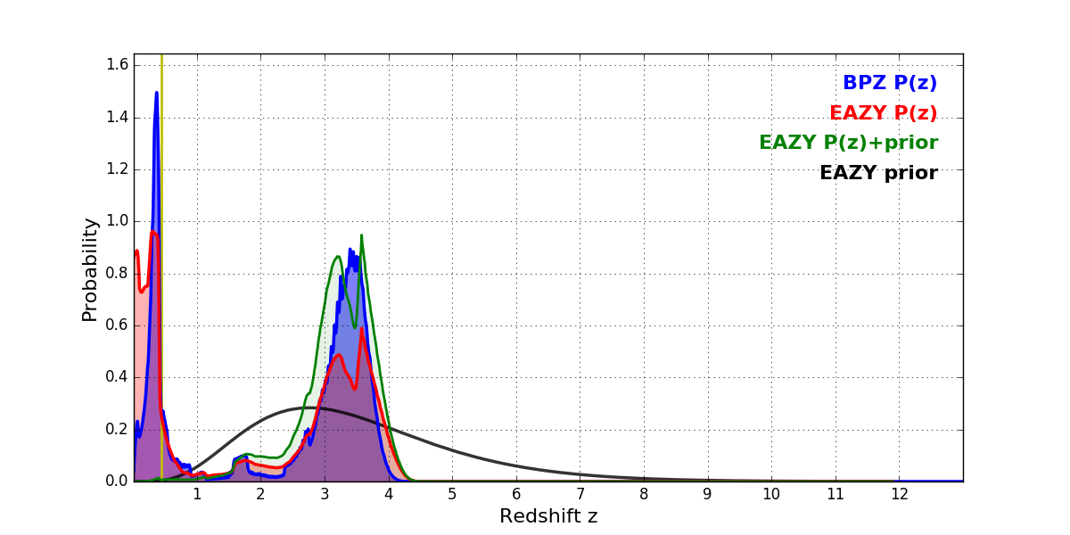 In P(z) plots: Yellow lines mark the cluster redshift z = 0.443,