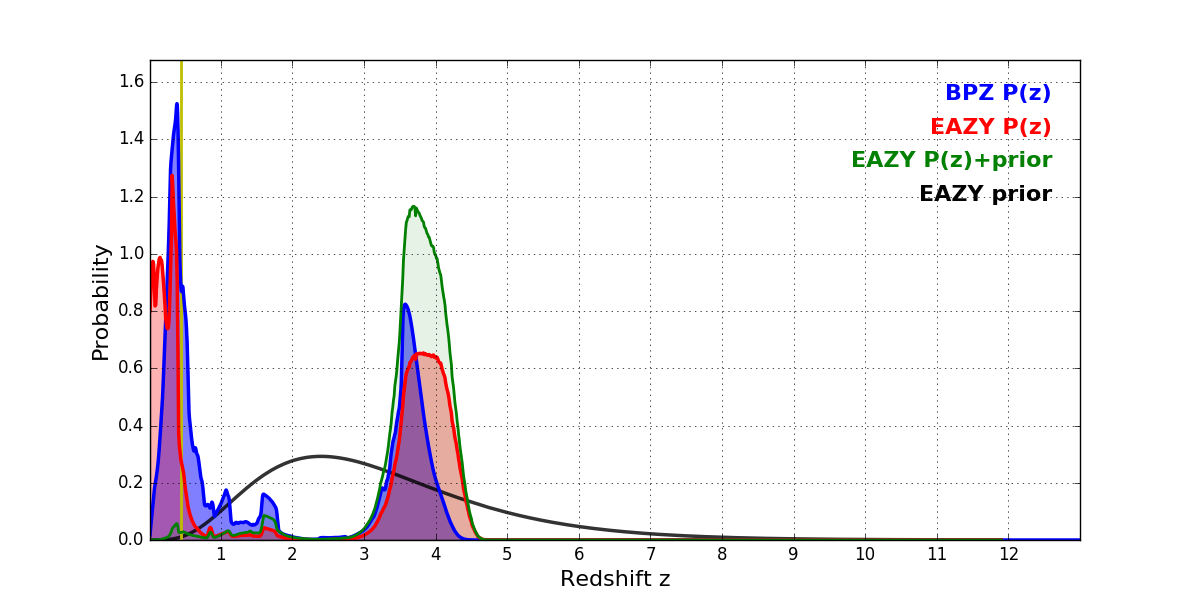 In P(z) plots: Yellow lines mark the cluster redshift z = 0.443,