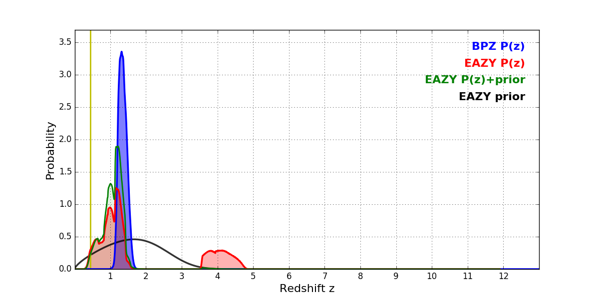 In P(z) plots: Yellow lines mark the cluster redshift z = 0.443,