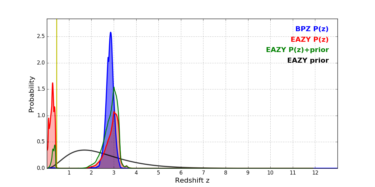 In P(z) plots: Yellow lines mark the cluster redshift z = 0.443,