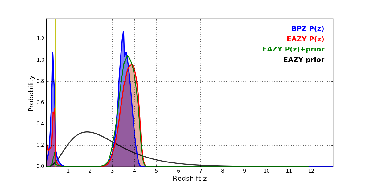 In P(z) plots: Yellow lines mark the cluster redshift z = 0.443,