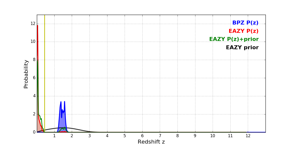In P(z) plots: Yellow lines mark the cluster redshift z = 0.443,