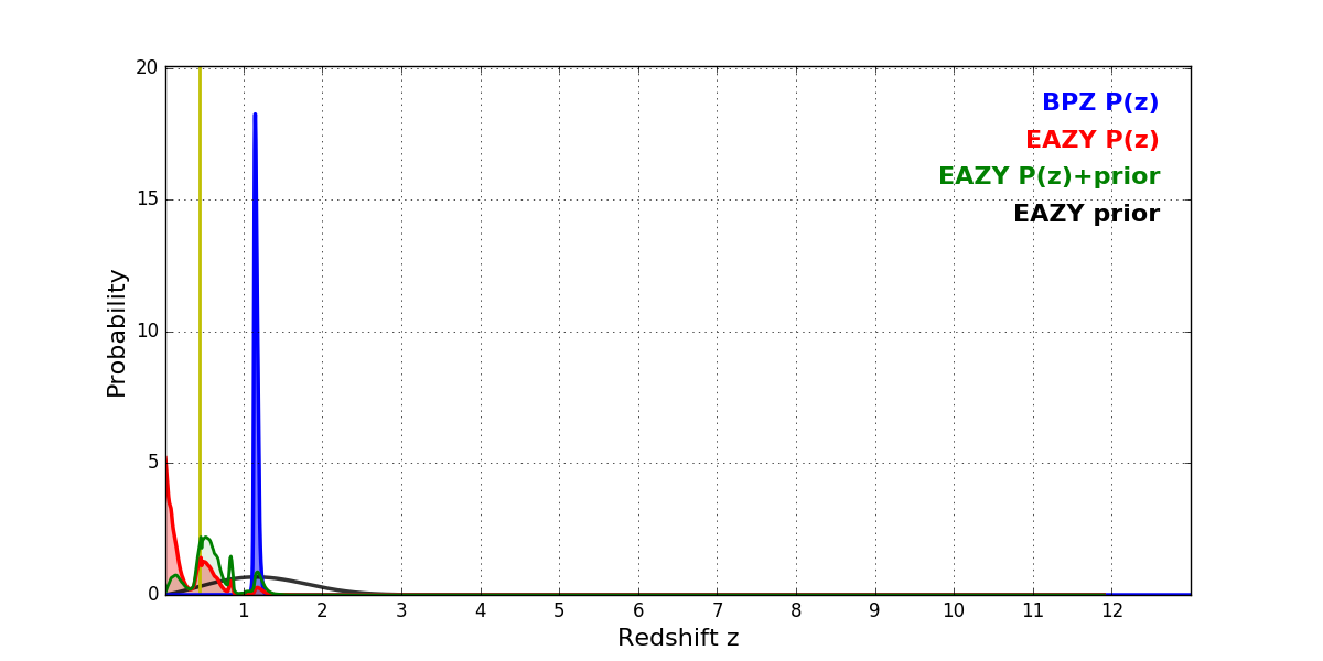 In P(z) plots: Yellow lines mark the cluster redshift z = 0.443,