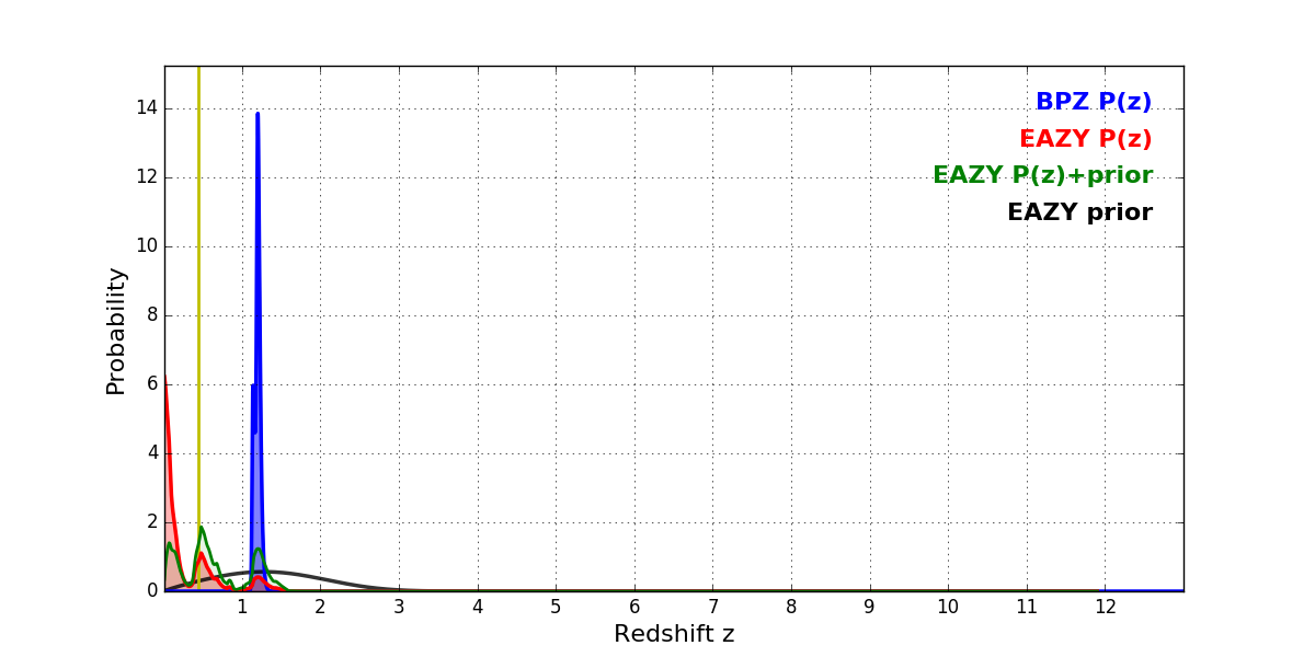 In P(z) plots: Yellow lines mark the cluster redshift z = 0.443,