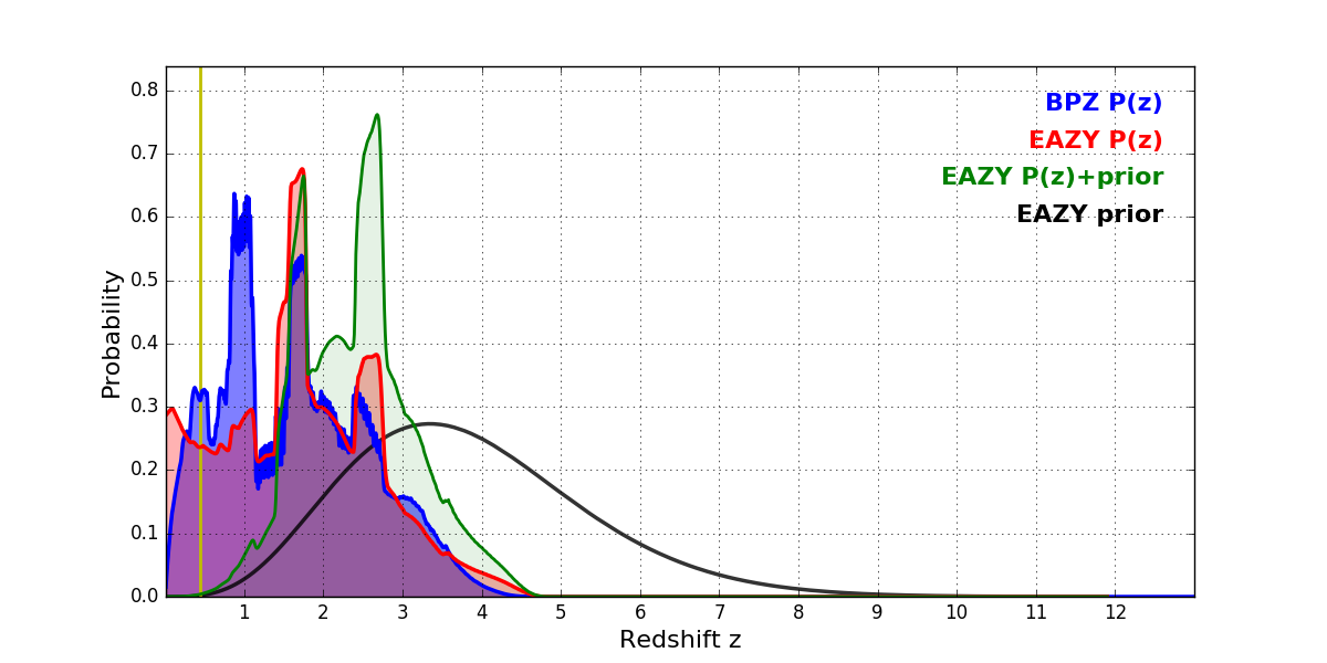 In P(z) plots: Yellow lines mark the cluster redshift z = 0.443,