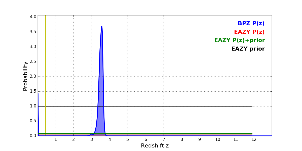 In P(z) plots: Yellow lines mark the cluster redshift z = 0.443,