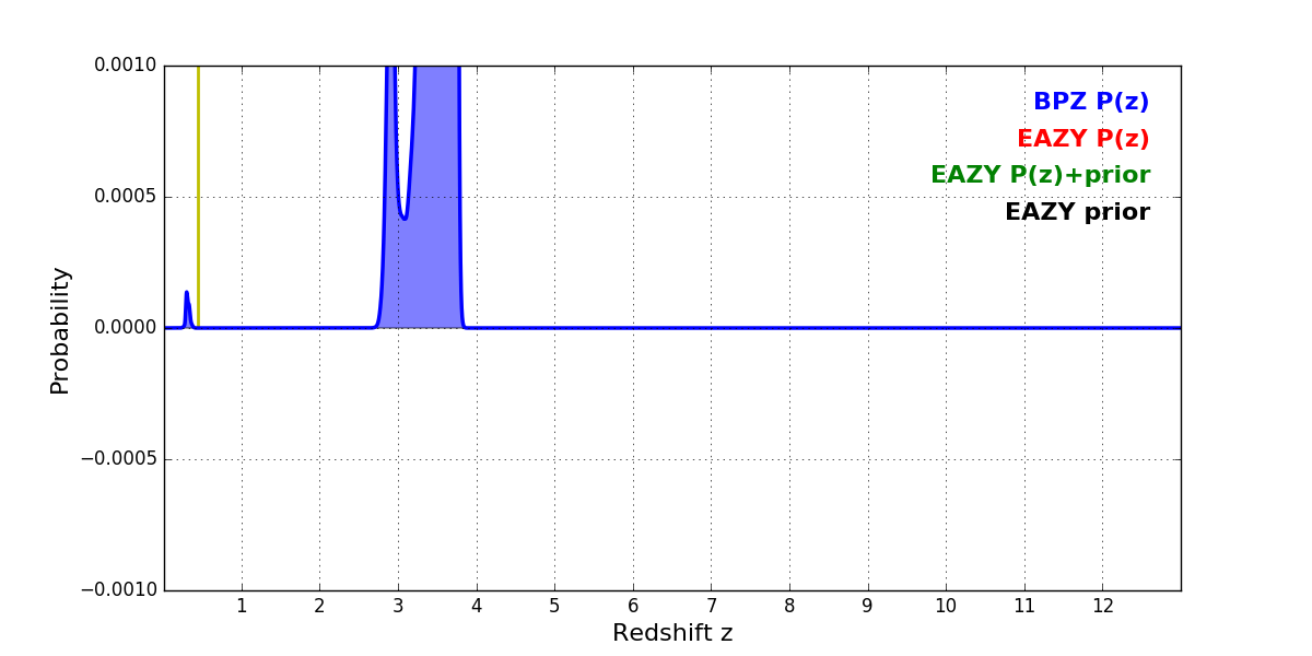 In P(z) plots: Yellow lines mark the cluster redshift z = 0.443,
