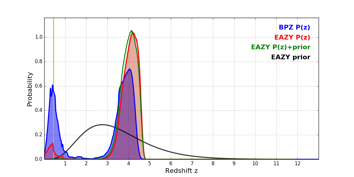 In P(z) plots: Yellow lines mark the cluster redshift z = 0.443,