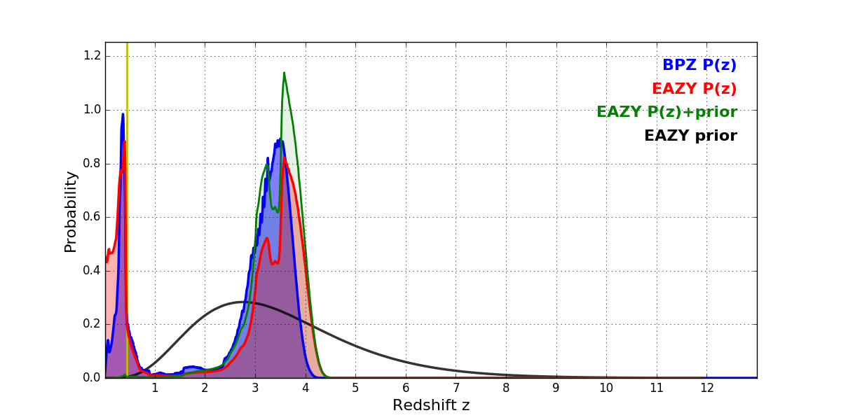 In P(z) plots: Yellow lines mark the cluster redshift z = 0.443,