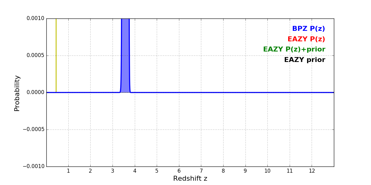 In P(z) plots: Yellow lines mark the cluster redshift z = 0.443,
