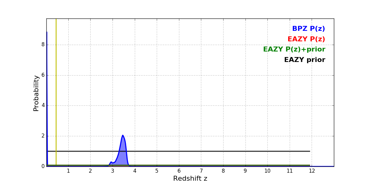 In P(z) plots: Yellow lines mark the cluster redshift z = 0.443,