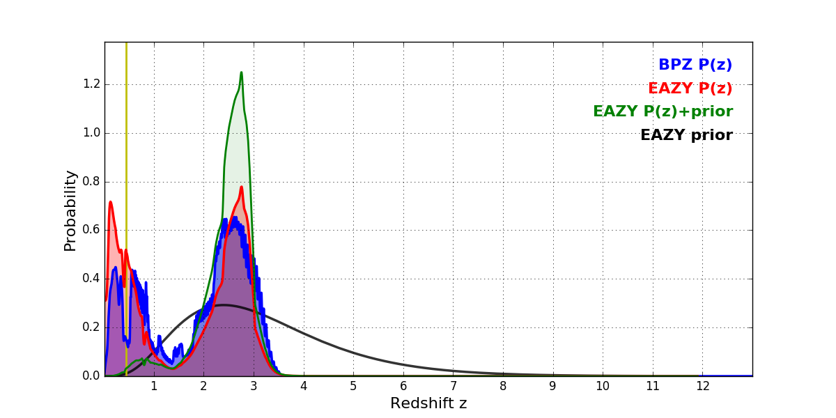 In P(z) plots: Yellow lines mark the cluster redshift z = 0.443,