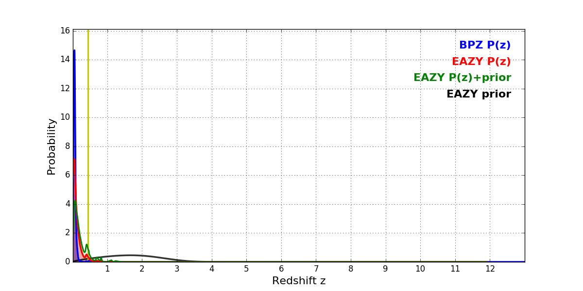 In P(z) plots: Yellow lines mark the cluster redshift z = 0.443,