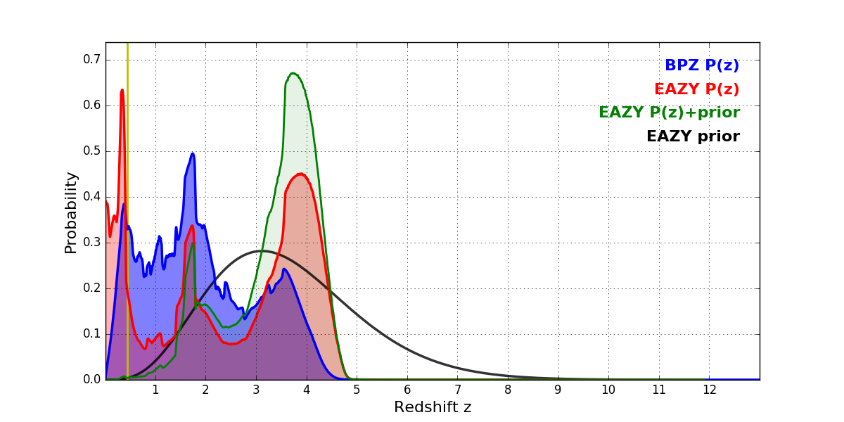 In P(z) plots: Yellow lines mark the cluster redshift z = 0.443,