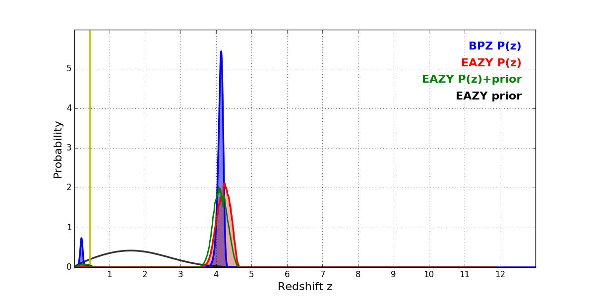 In P(z) plots: Yellow lines mark the cluster redshift z = 0.443,