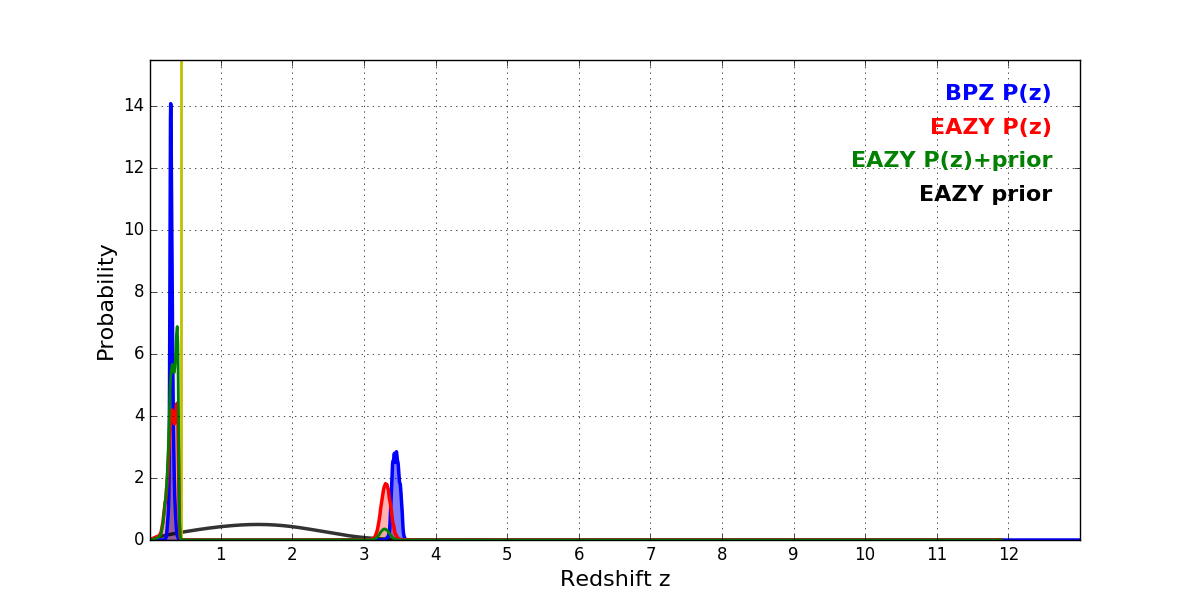 In P(z) plots: Yellow lines mark the cluster redshift z = 0.443,
