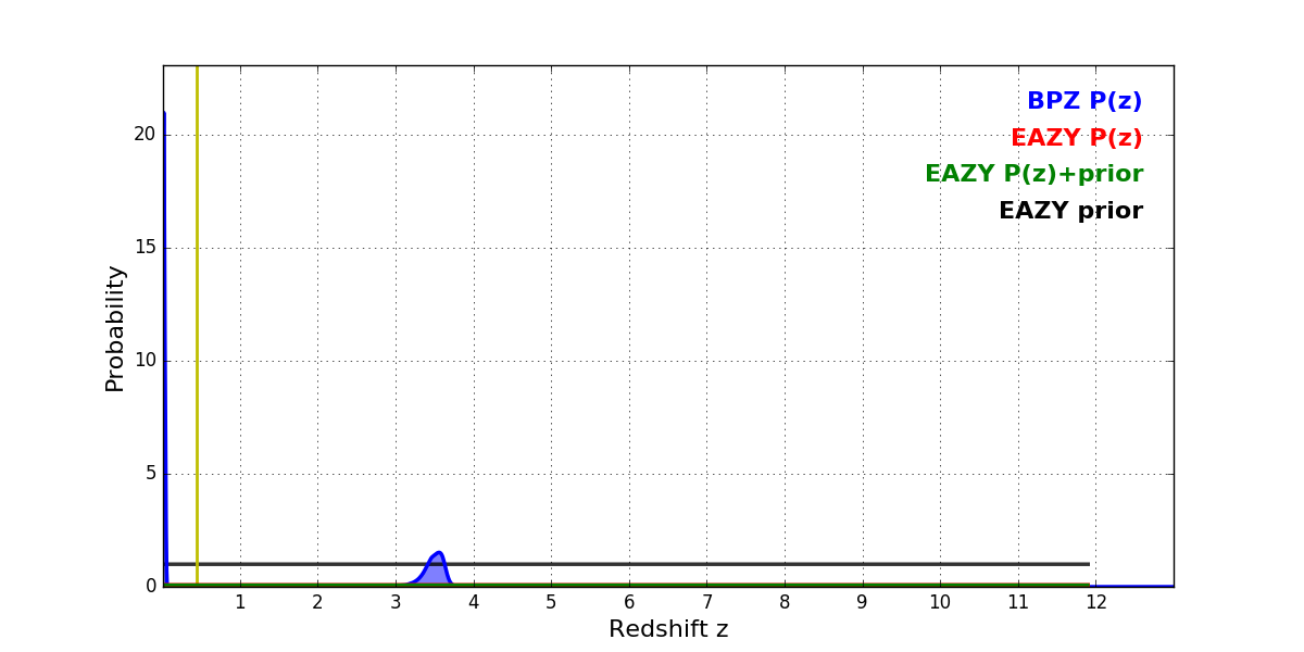 In P(z) plots: Yellow lines mark the cluster redshift z = 0.443,