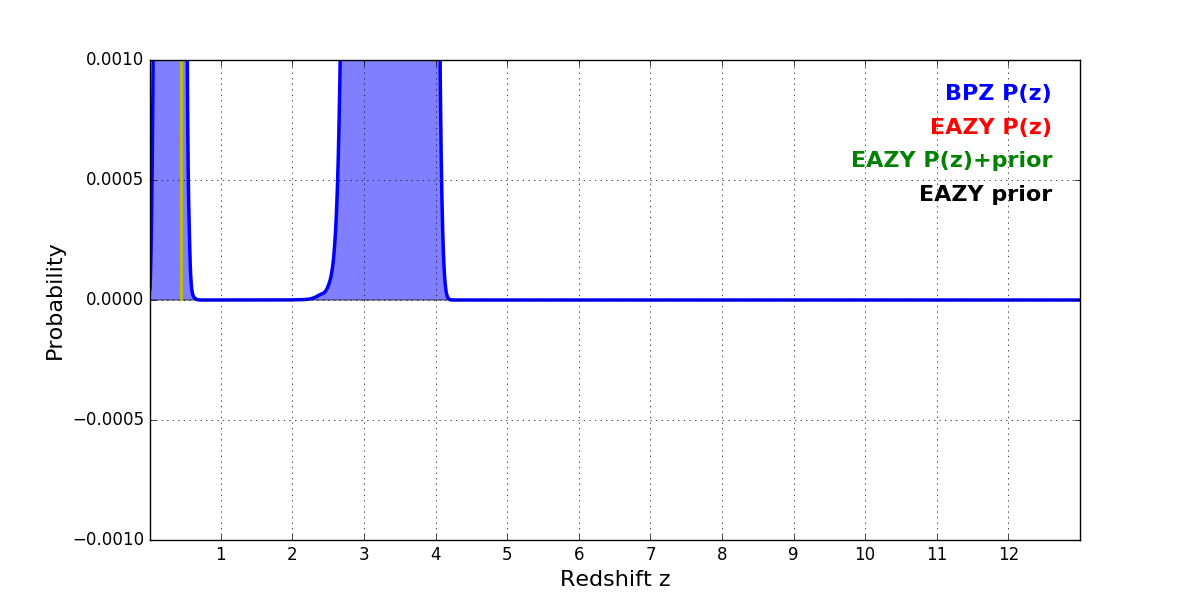 In P(z) plots: Yellow lines mark the cluster redshift z = 0.443,