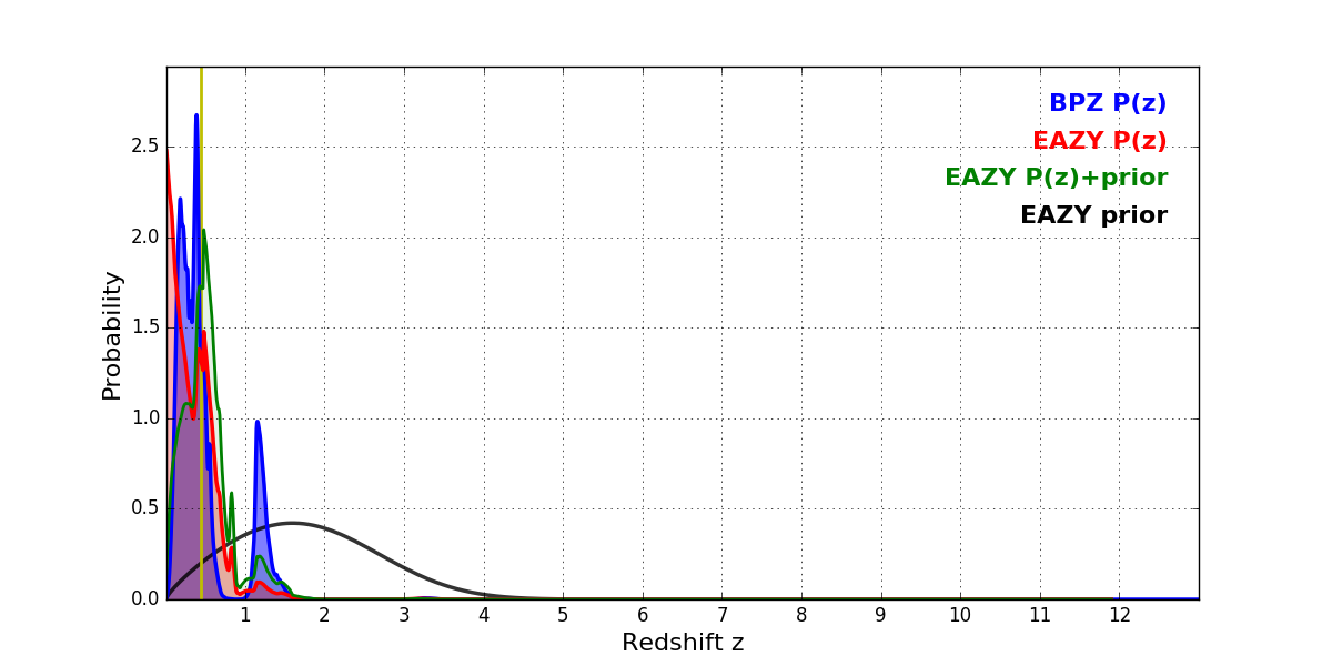 In P(z) plots: Yellow lines mark the cluster redshift z = 0.443,