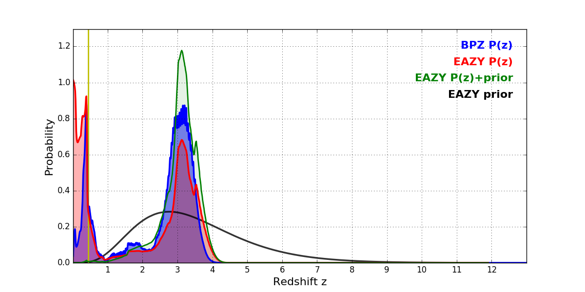 In P(z) plots: Yellow lines mark the cluster redshift z = 0.443,