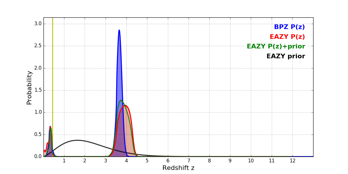 In P(z) plots: Yellow lines mark the cluster redshift z = 0.443,