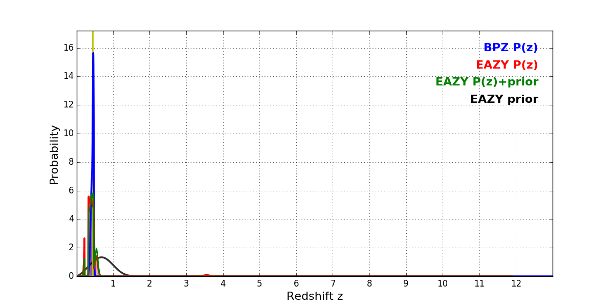 In P(z) plots: Yellow lines mark the cluster redshift z = 0.443,