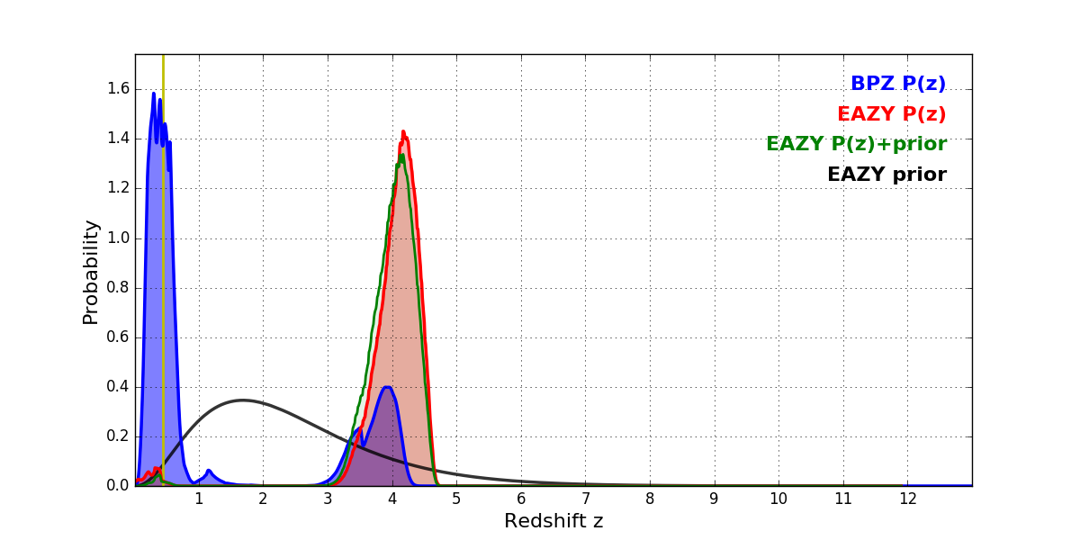 In P(z) plots: Yellow lines mark the cluster redshift z = 0.443,
