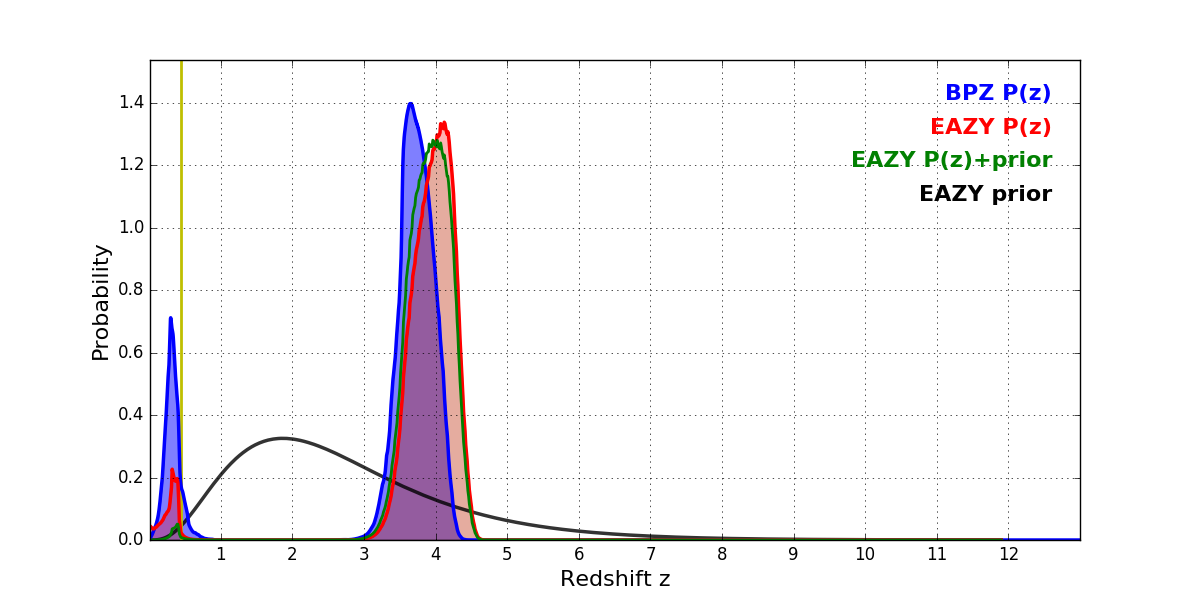 In P(z) plots: Yellow lines mark the cluster redshift z = 0.443,