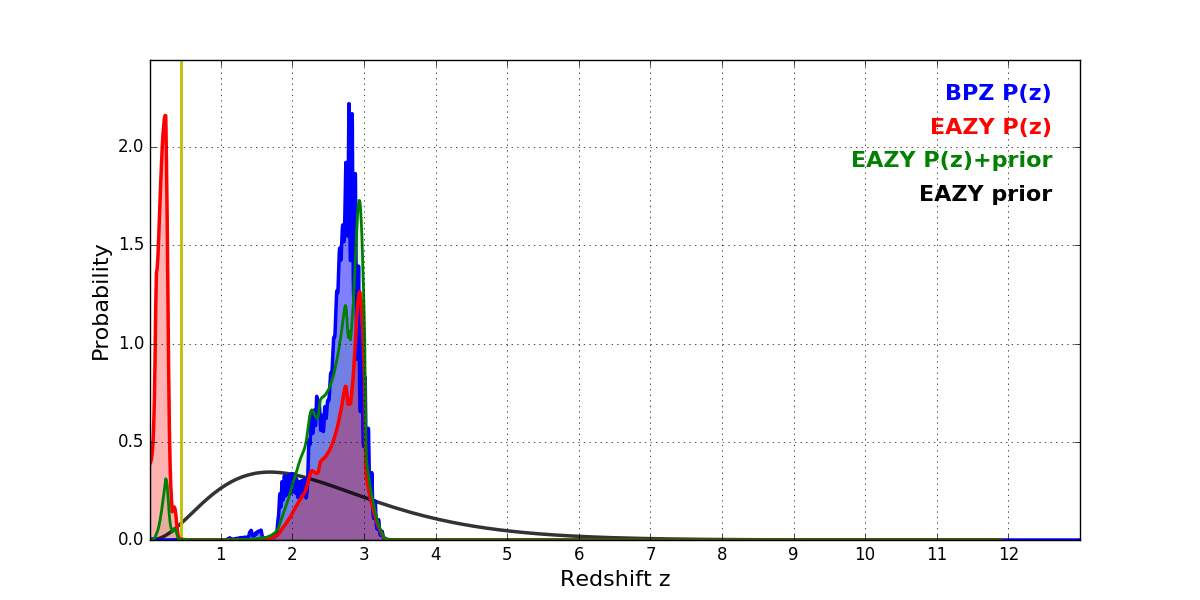 In P(z) plots: Yellow lines mark the cluster redshift z = 0.443,