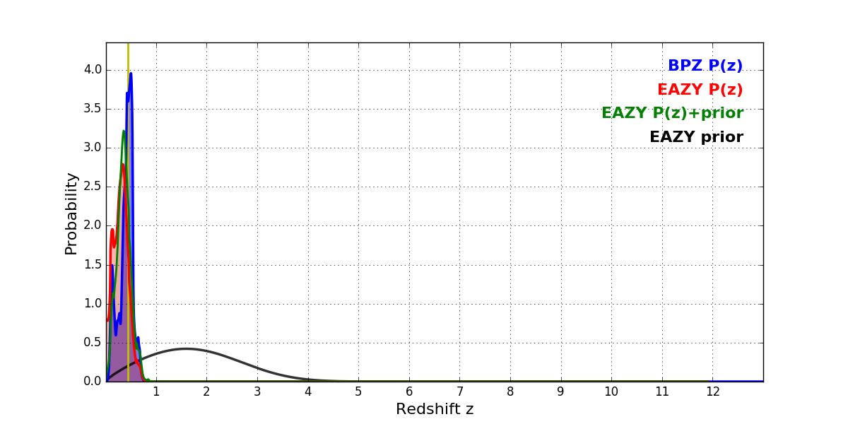 In P(z) plots: Yellow lines mark the cluster redshift z = 0.443,