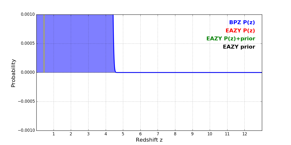 In P(z) plots: Yellow lines mark the cluster redshift z = 0.443,
