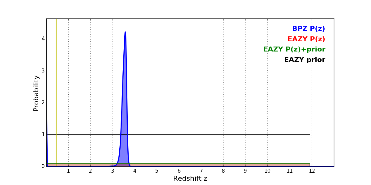 In P(z) plots: Yellow lines mark the cluster redshift z = 0.443,