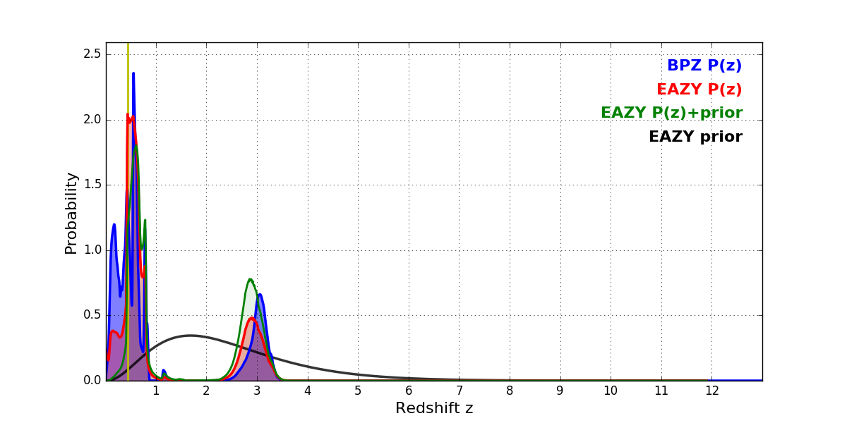 In P(z) plots: Yellow lines mark the cluster redshift z = 0.443,