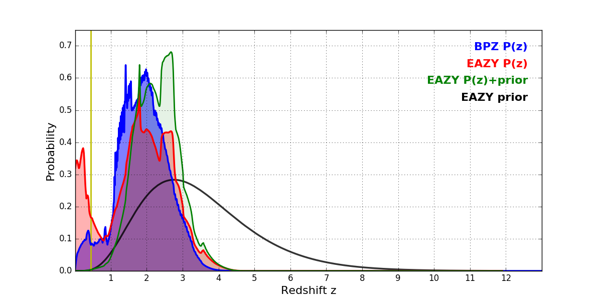 In P(z) plots: Yellow lines mark the cluster redshift z = 0.443,